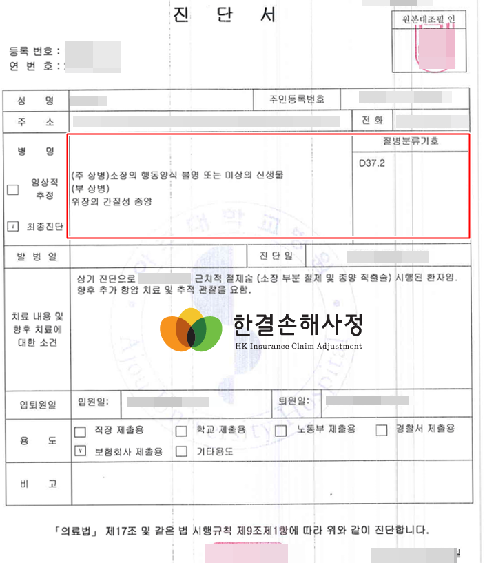 진단서의 변경이나 수정 없이 암진단비 보험금 처리가 된 손해사정 사례를 소개하여 드립니다.