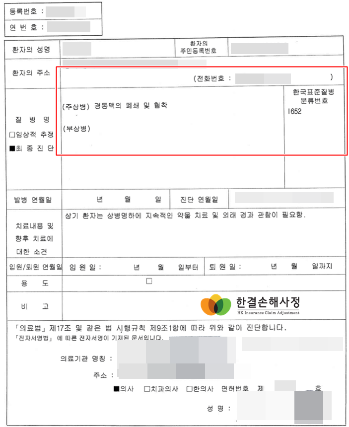 병명은 경동맥의 폐쇄 및 협착으로 되어 있었고 i652 코드가 진단서에 확인되었습니다.