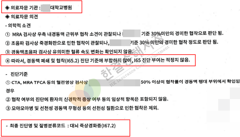 보험회사의 예상 결과대로 경동맥의 폐쇄 및 협착 진단은 적절치 않다는 의견이 나왔습니다.